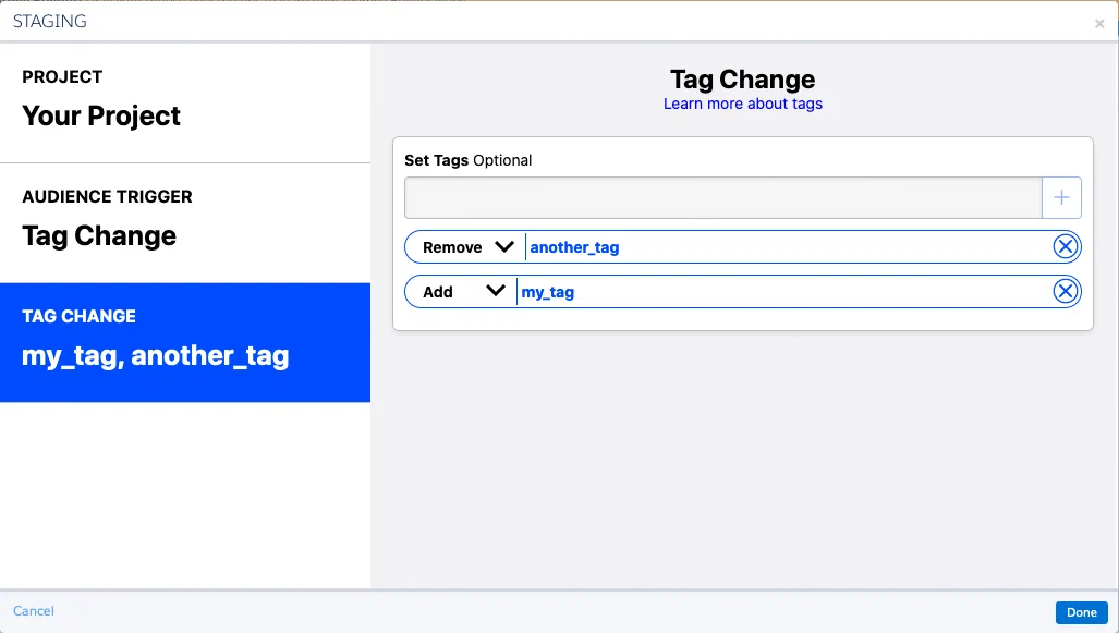 Setting tag change actions in an SFMC journey - Select Done.