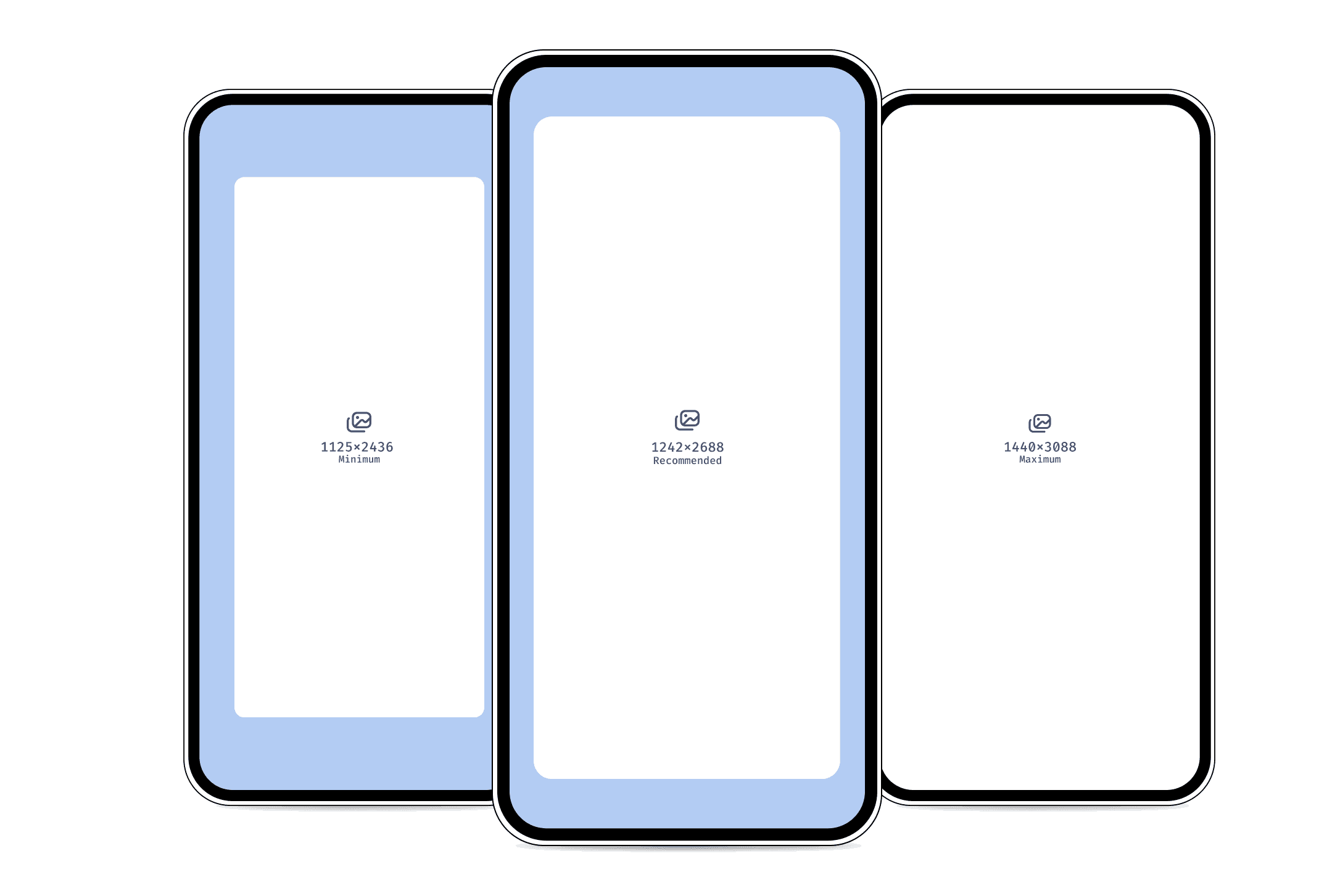 | Fullscreen | 1125 x 2436 px1 | 1440 x 3088 px2 | 1242 x 2688 px3 | 19.5:94 |