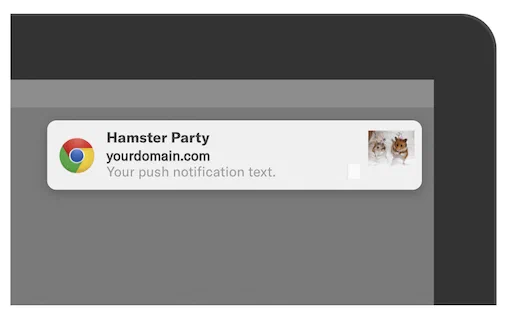 You can add an image to your Web Push NotificationA message that appears in the top or bottom right corner of a web browser or in a notification center.On mobile devices, web push notifications appear similar to push notifications. content and TemplatesReusable message content. Templates support personalization using merge fields and other logic.. The image appears in web push notifications in Chrome and Opera browsers on Windows and Android platforms.