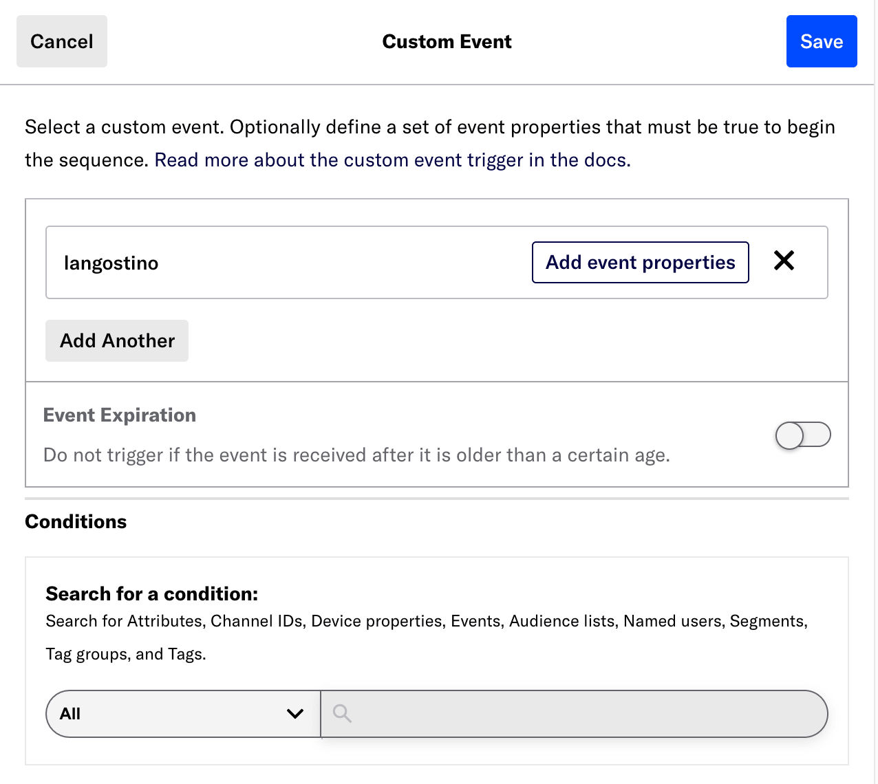 With today’s release, you’ll now see Conditions when configuring SequenceA series of messages that is initiated by a trigger. Airship sends messages in the series based on your timing settings, and you can also set conditions that determine its audience and continuation. Sequences can be connected to each other and to other messaging components to create continuous user experiences in a Journey. triggers. Use this section to build a SegmentA grouping of audience members selected by unique or shared identifiers. Multiple identifiers can be combined within a Segment.. Users must meet the conditions defined in the segment in order to enter the sequence.