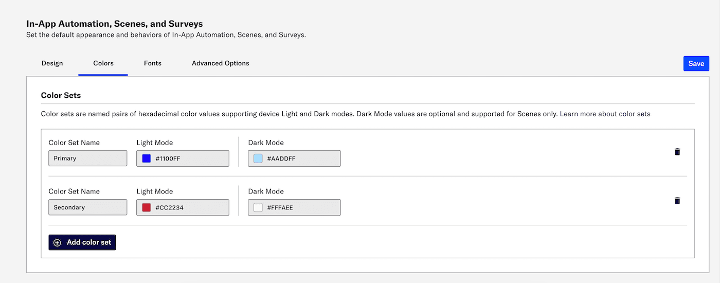 A color set is a named pair of hexadecimal color values supporting device Light and Dark modes. Color sets can be selected for any color field in a SceneA mobile app or web experience of one or more screens displayed with fully native UI components in real time, providing immediate, contextual responses to user behaviors. Scenes can be presented in full-screen, modal, or embedded format using the default swipe/click mode or as a Story. They can also contain survey questions. and when configuring the default appearance of Scenes, SurveysA question-and-answer experience used to collect and aggregate feedback or generate a net promoter score. The Survey composer was deprecated September 9, 2024. All Survey composer functionality is available in Scenes., and In-App AutomationMessages cached on users’ devices and displayed when users meet certain conditions within your app, such as viewing a particular screen or opening the app a certain number of times.. Dark mode is supported for Scenes only.