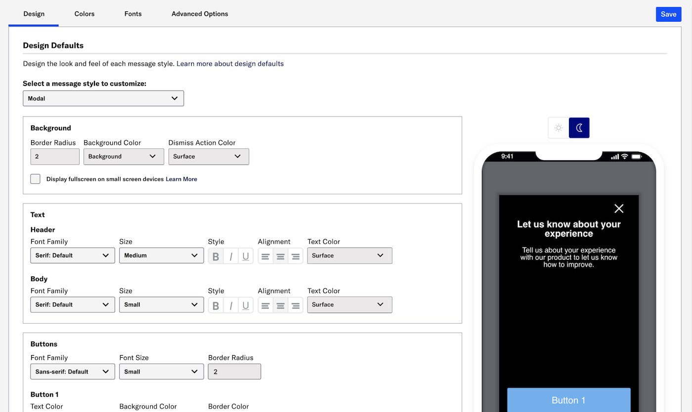 When you set design defaults for the background, text, and buttons in your in-app experiences, those settings appear pre-configured in the Survey, Scene, and In-App Automation composers.