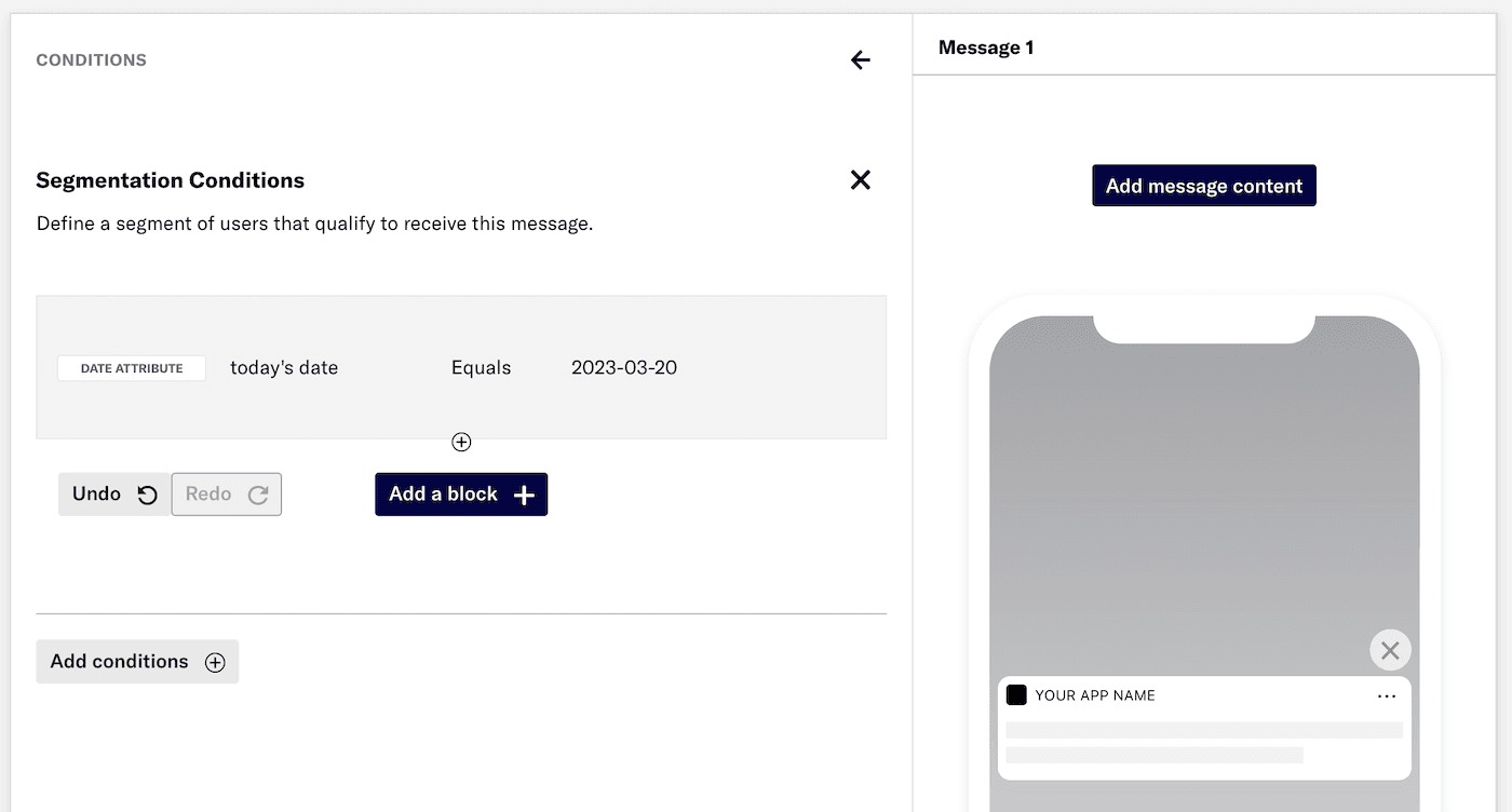 Conditions are requirements your audience must meet in order to receive a message from a sequence. If a member of the audience doesn’t meet the conditions, they will not receive the message or any subsequent messages. They will exit the sequence.