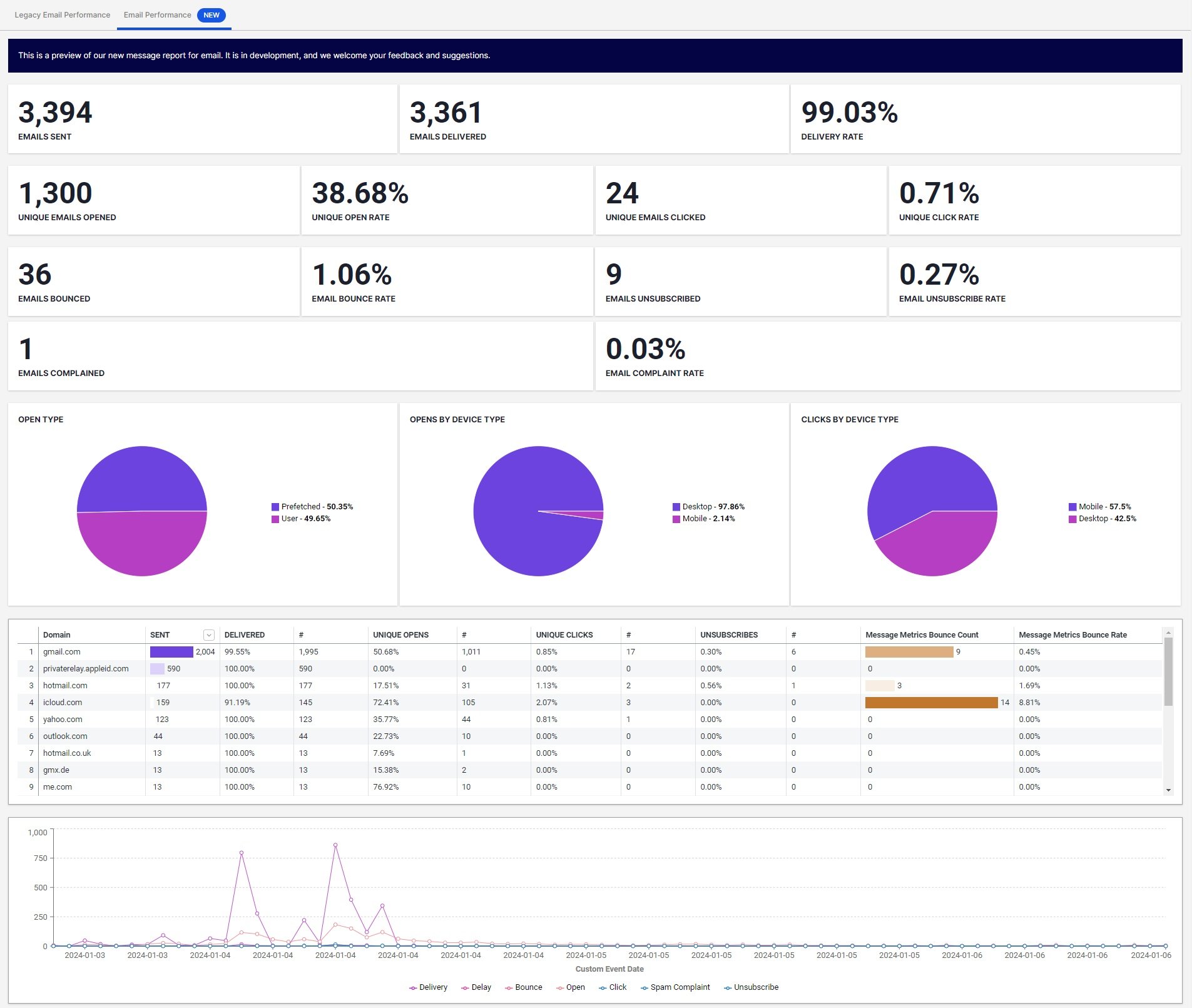 The report will load with the new metrics in the Email Performance section, and you can select the Legacy Email Performance tab to see the older metrics: