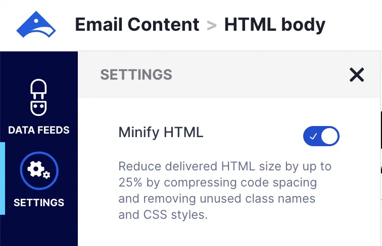 Select Settings in the sidebar, and then enable Minify HTML. When applying the setting to an existing message, you do not need to change anything else in the message before saving.