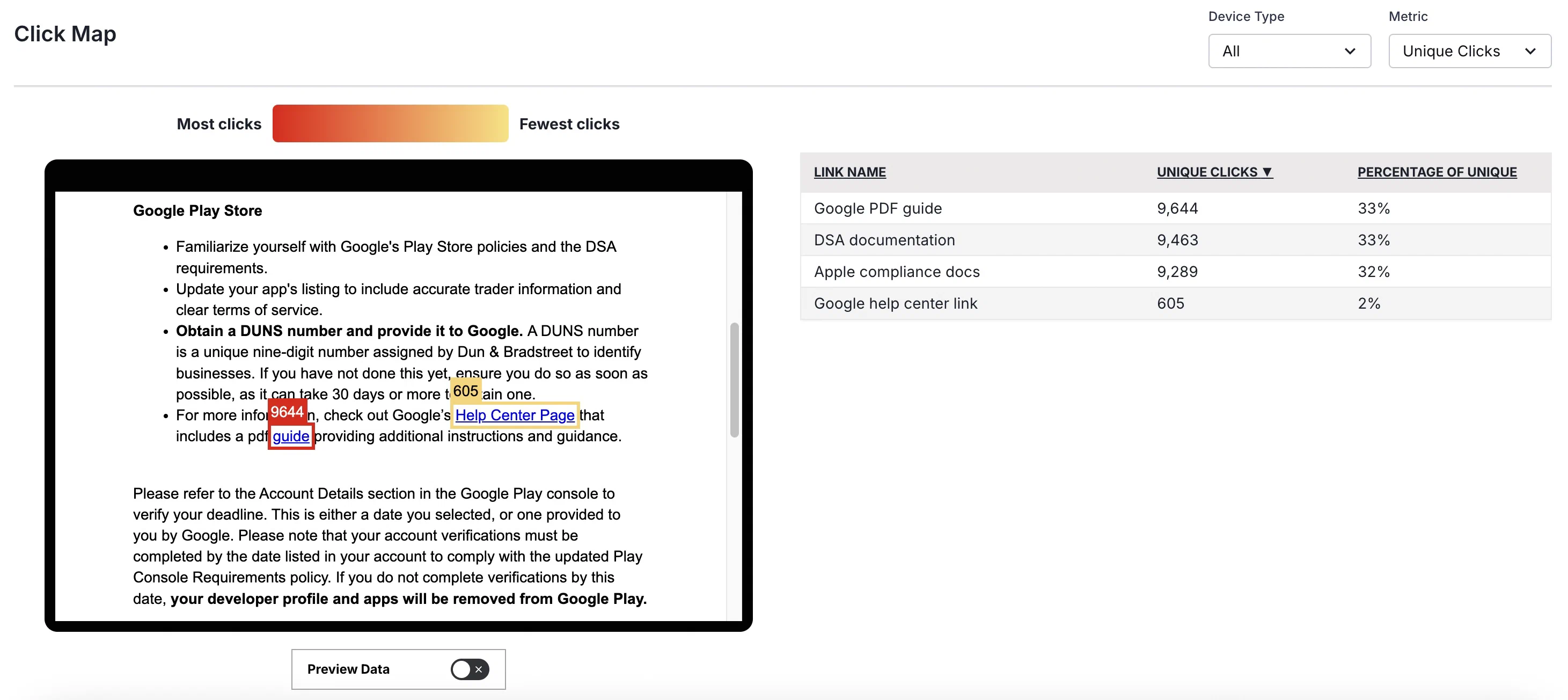 Within a preview of the message body, any named link clicked by a user is highlighted. The volume of clicks is indicated by a highlight color in a gradient from red (most) to yellow (fewest). A table lists the same links with click counts and the percentage of clicks relative to all links in the message. You can filter the preview and table by device type and Total Clicks or Unique Clicks.