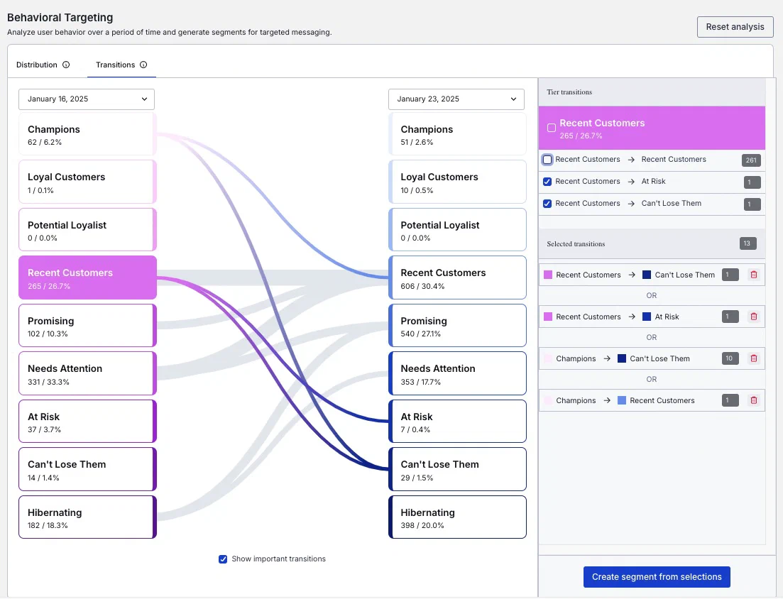 Behavioral Targeting analyzes user behaviors using the Recency, Frequency, Monetary model. You can create Segments from selected tiers and transitions within the reports and use them to target specific users.