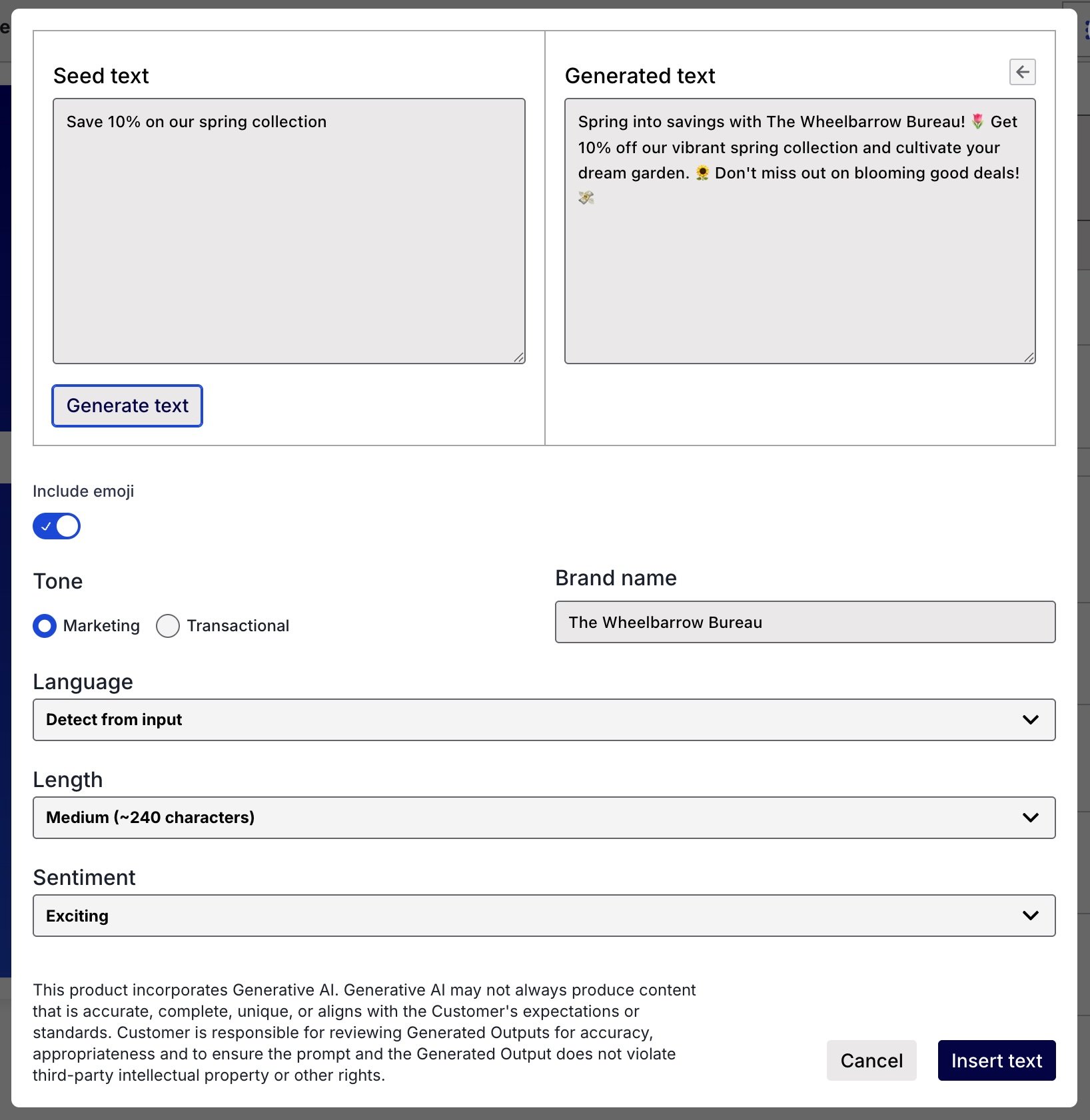 In most text fields in templates and when composing messages, select the “AI” icon to start generating text. Enter your own seed text and set: