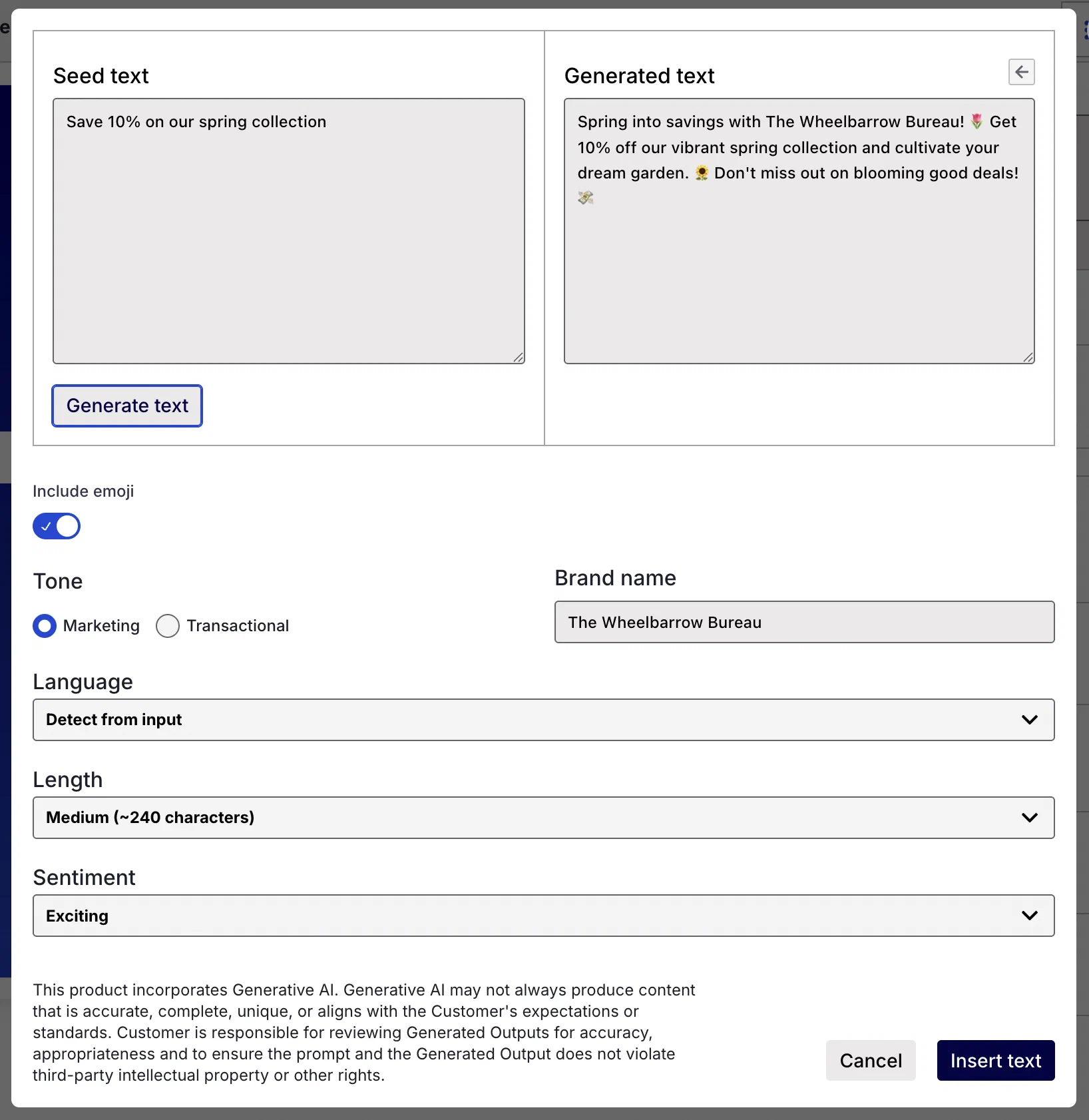 You can also include your brand name and emoji 😎. The original and generated content appear side by side, and you can transfer the generated text to use as new seed text.