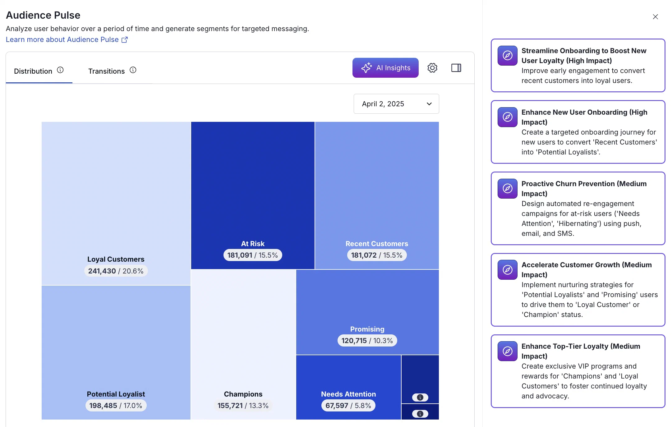 Audience Pulse analyzes user activity using the Recency, Frequency, Monetary model, organizing users into tiers based on their engagement patterns. You can create Segments from selected tiers and transitions to target specific users.