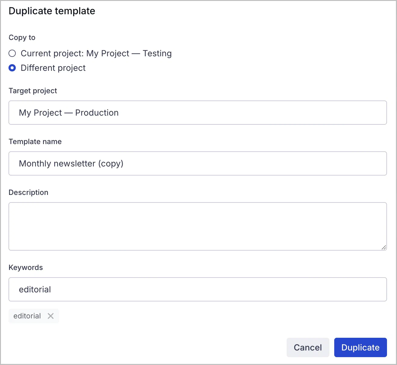 Copy your content from one project to another right from the dashboard. Whether you’re promoting from test to production or sharing across brands and regions, reuse what works without starting over.