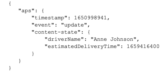 Push notifications play an important role in iOS Live Activities but add complexity, as each Live Activity has its own pushToken to manage. A Live Activity is active for up to 8 hours unless your app or the user explicitly ends it. Your app can update the content of a Live Activity from the app if it is active and can use push notifications to update it whether it’s active or suspended. Each update to your Live Activity can include up to 4KB of data. Here is a straightforward example of a push notification that updates the driver name and estimated delivery time of a Live Activity: