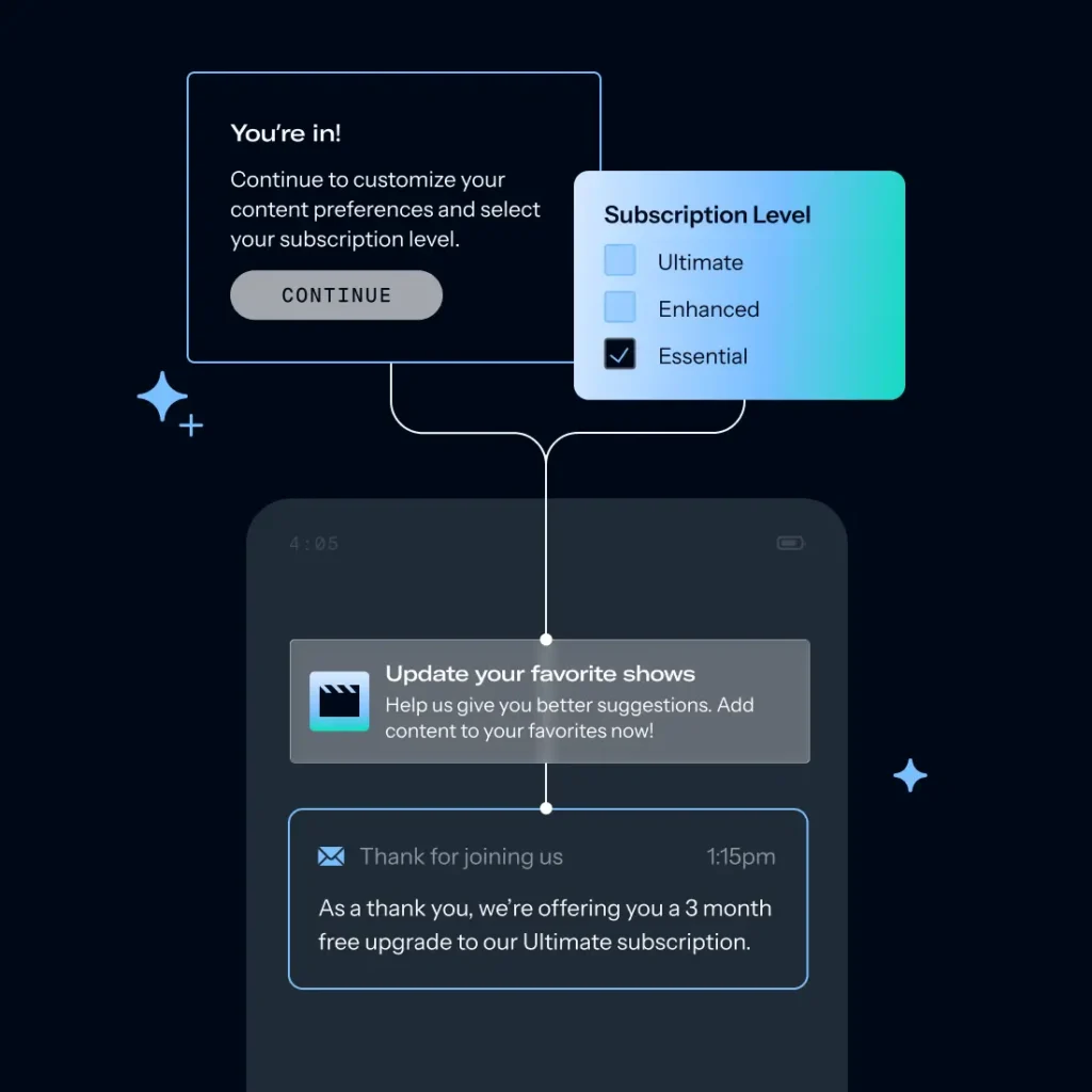 Help new users discover value fast with timely nudges that simplify onboarding, identity capture, and subscription setup.