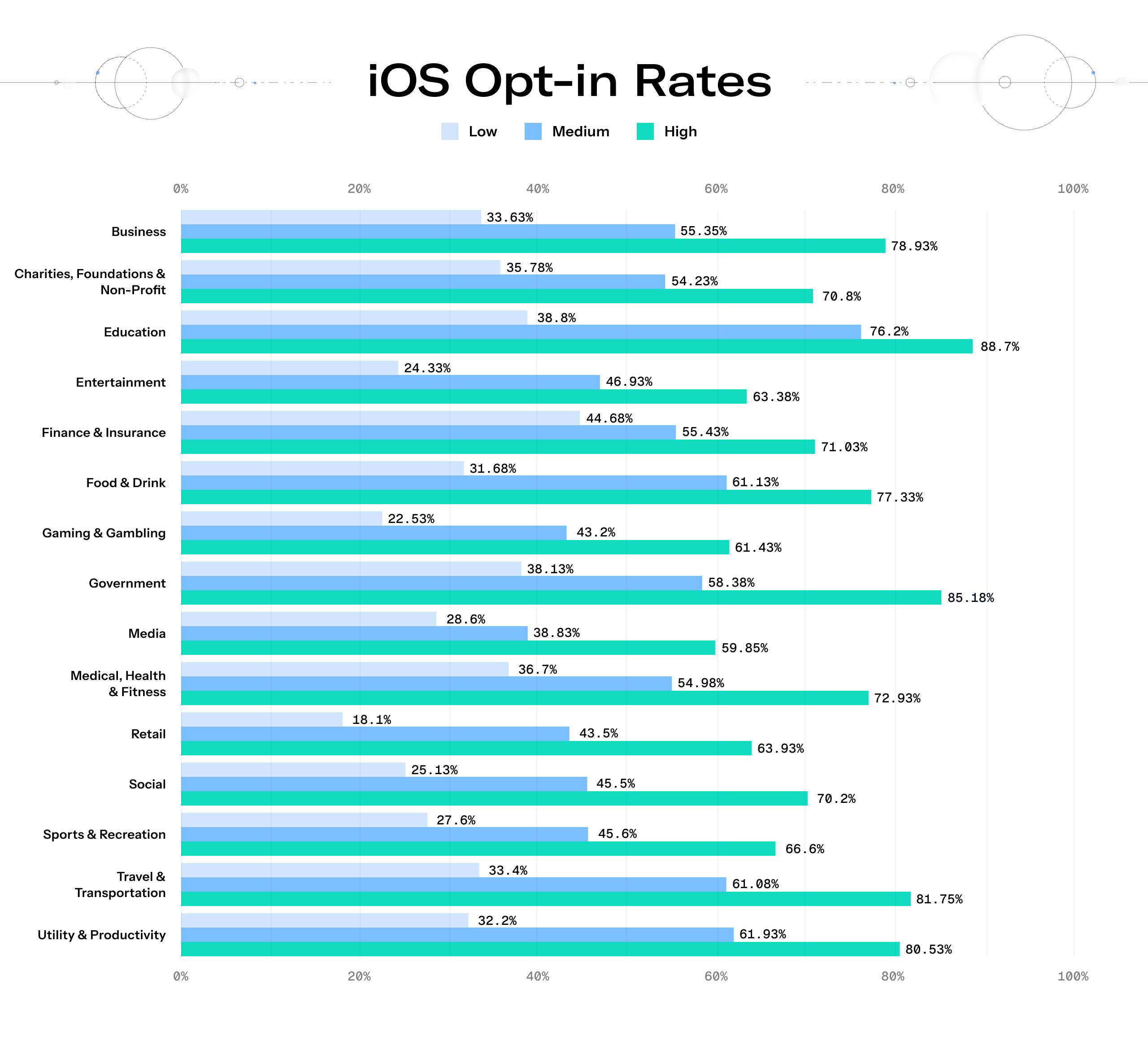 On the surface, sending mass promotional push notifications seems like a quick way to drive sales. But the Retail and Gaming verticals face some of the harshest realities if they’re not careful with their promotional blasts. Retail has the lowest floor on iOS at 18.1%, while Gambling & Gaming sees the lowest floor on Android at 21.35%.