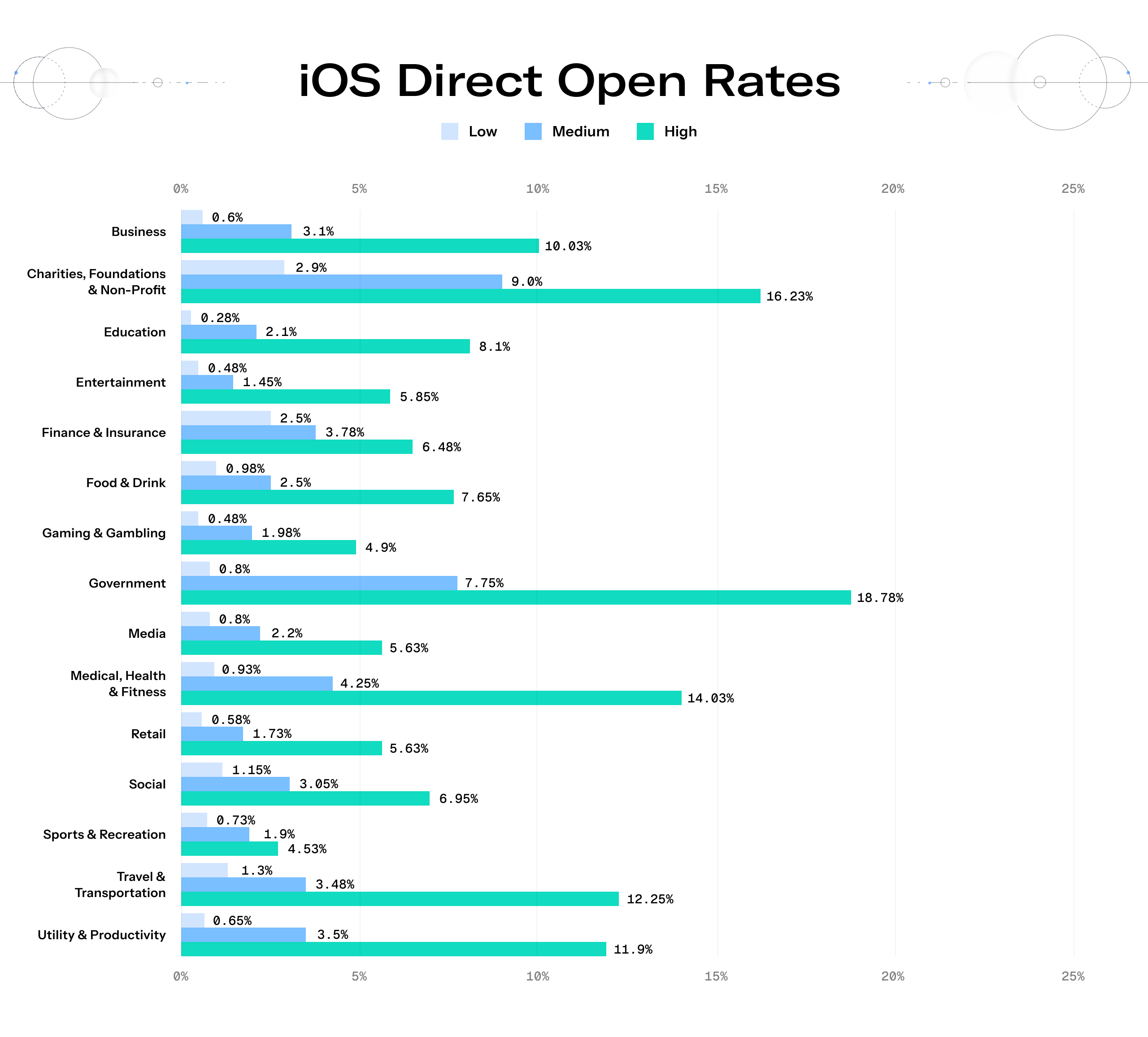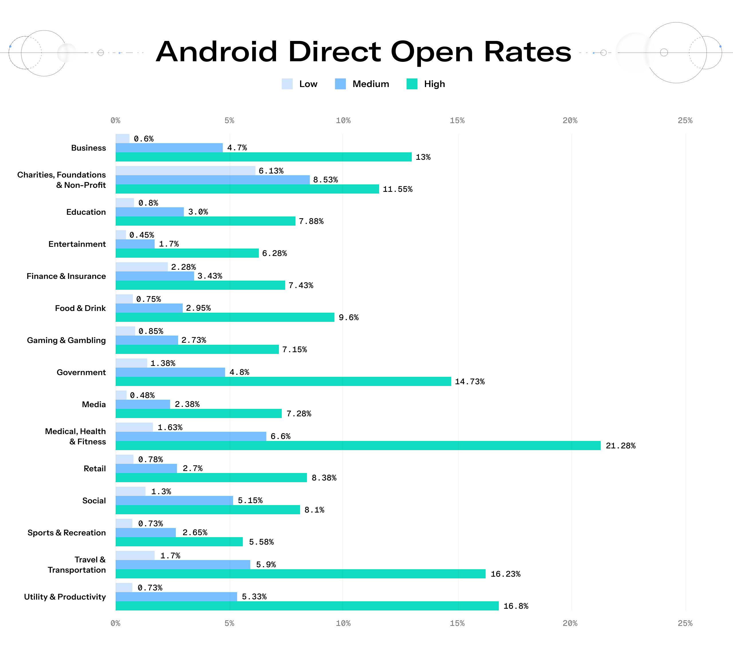 Across Android and iOS, the highest direct open rates belong to verticals that deliver highly personal, urgent, or mission-critical information.