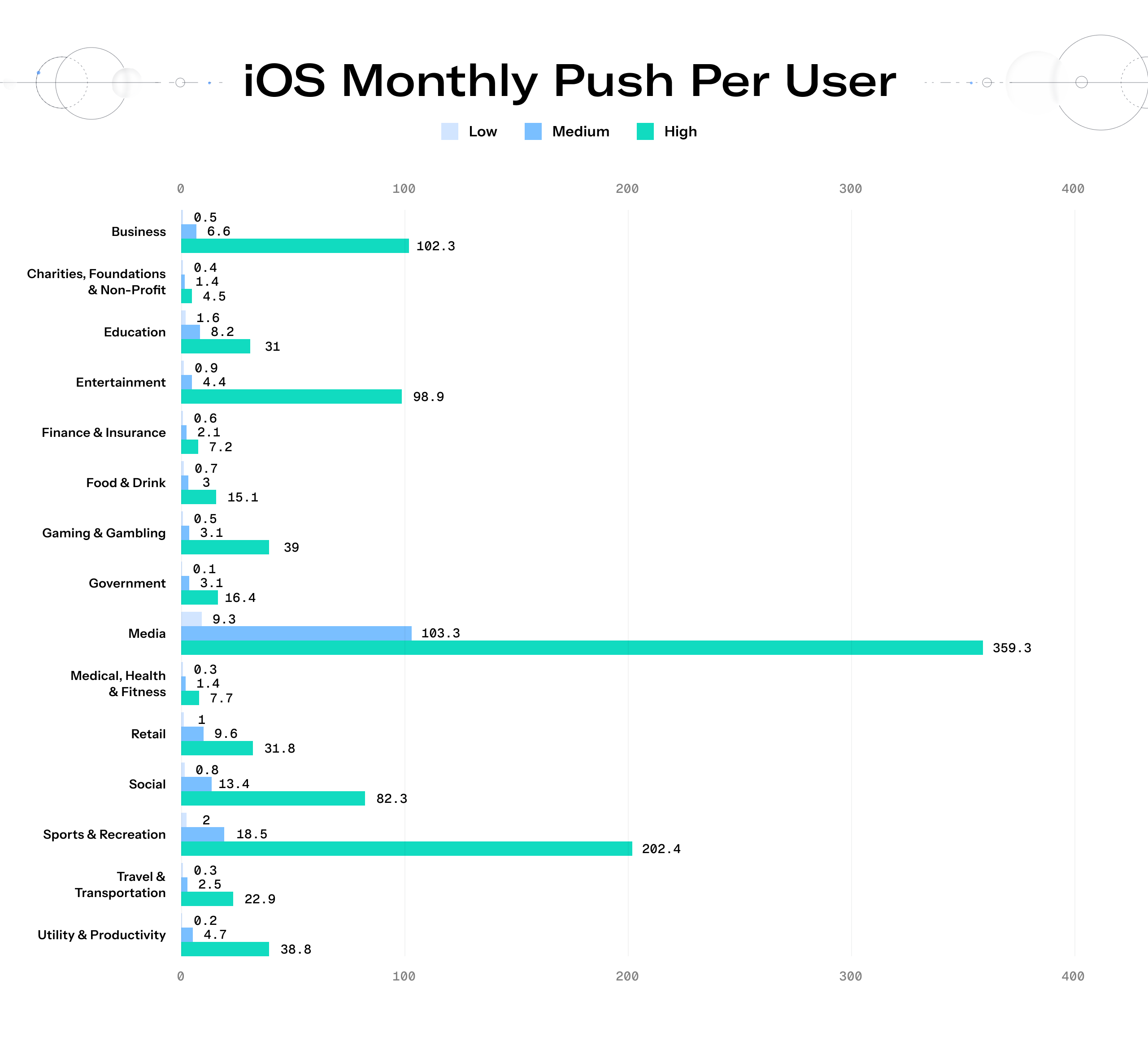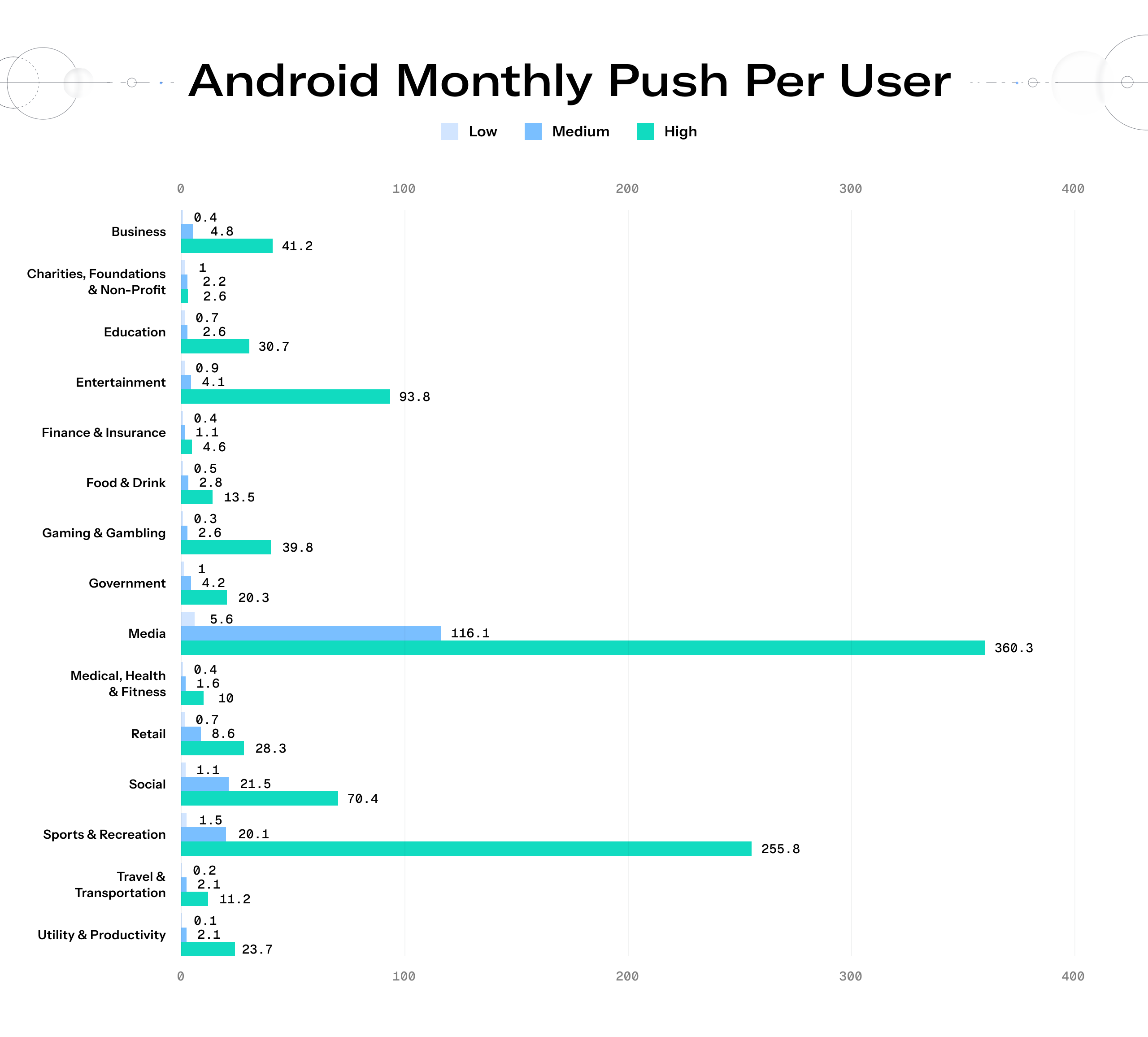 When your product is content, extreme high-frequency messaging is actually a competitive advantage. The Media vertical shatters the volume ceiling across both Android (360.3 pushes per user) and iOS (359.3 pushes per user) at the 90th percentile. This averages to more than ten notifications a day, a potentially catastrophic rate for a retail or utility app.