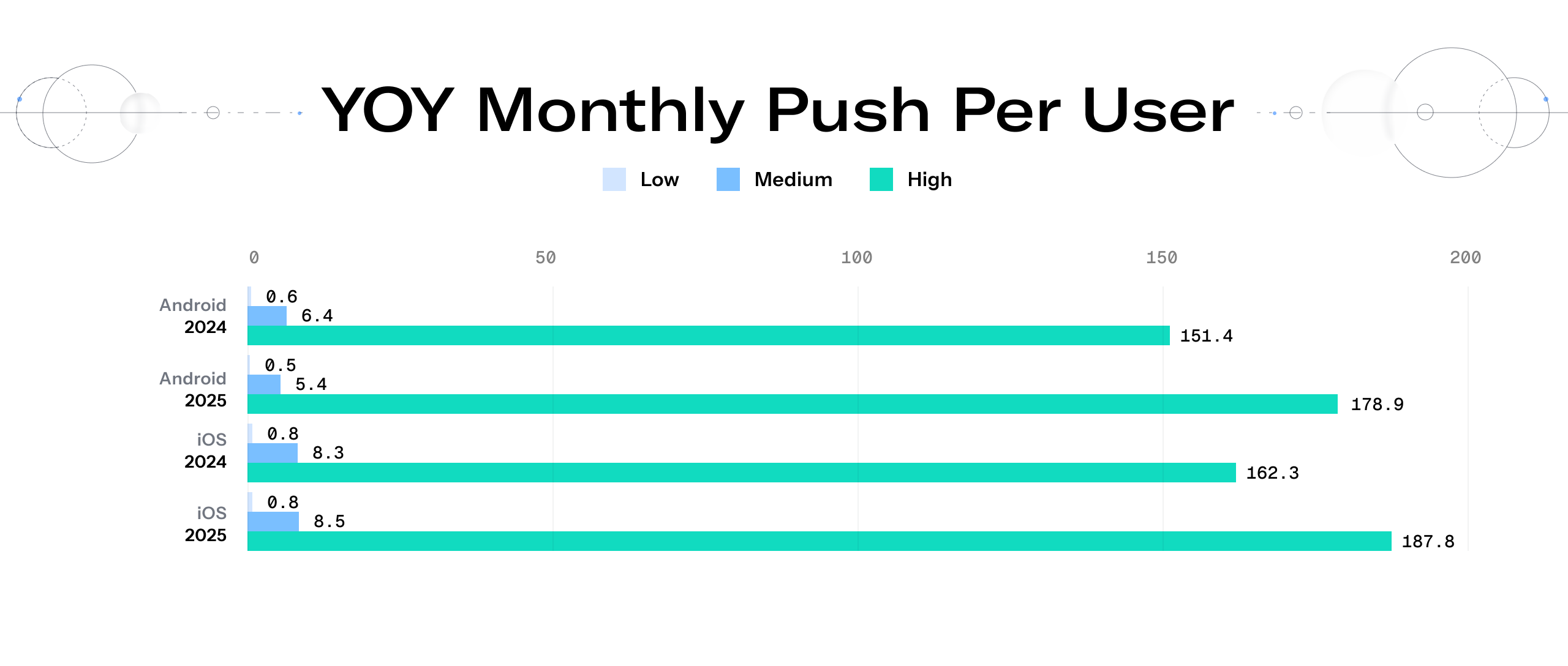 The apps that already send the most notifications (the 90th percentile) drastically increased their monthly output. On iOS, the high-tier volume jumped 15.71% to 187.8 pushes per user, while Android’s high tier climbed 18.16% to 178.9 pushes per user. The highest-volume senders are doubling down and sending even more.