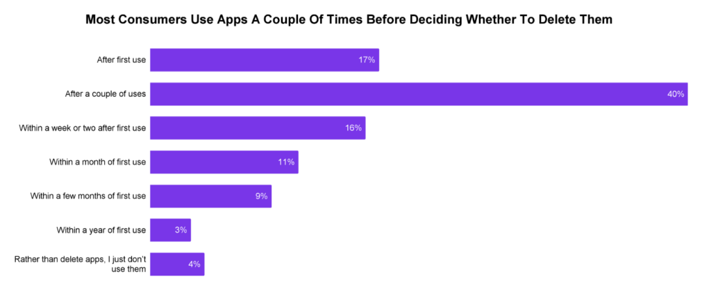 First and second impressions are everything for new app customers. Most consumers (57%) only use an app once or twice before deciding to delete it or not. Furthermore, within the first two weeks of downloading a new app, 73% of consumers will decide if they’ll delete it, a behavior consistent across all countries, household income levels and generations.
