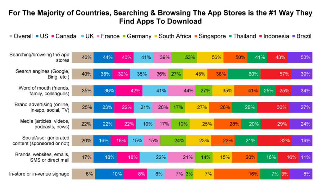 Searching and browsing app stores continues to be the top way people discover new apps to download. This holds true across household income levels, generations and the majority of countries. Search engines are the second most common app discovery method, followed by word of mouth (WOM). Personal recommendations are a key driver of app downloads in the U.K., France and Canada where consumers turn to WOM as much or more than the app stores. In the U.S., Germany and Singapore WOM is the second most common method of finding apps.