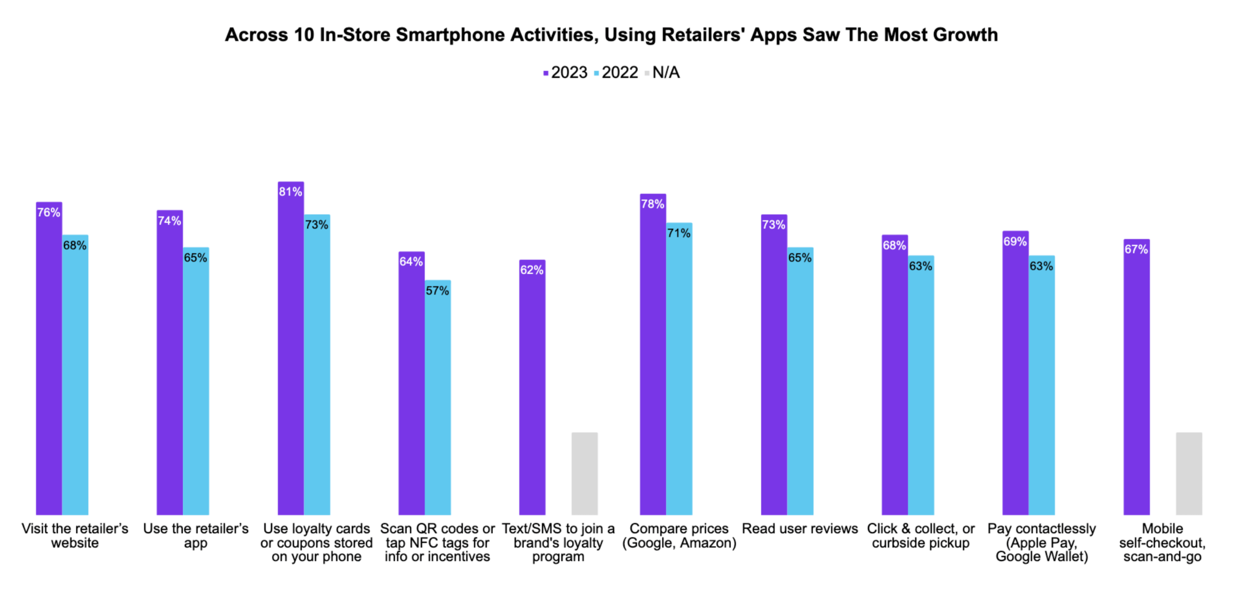 Of all the ways shoppers use smartphones in stores, using the retailer’s app has grown the most