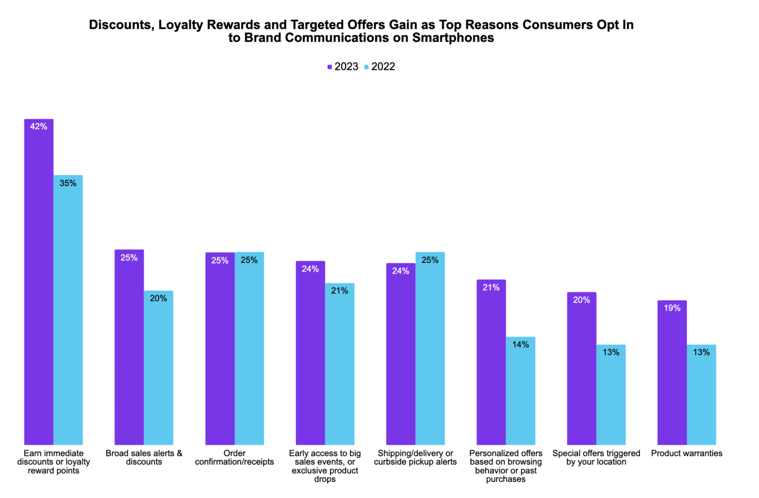 Mobile apps have an inherent advantage to reach people wherever they are at the exact moment it matters most, as notifications are served up on smartphone lock screens. When consumers were asked what motivates them to opt in to receive brand communications on their smartphone, discounts, loyalty rewards and offers personalized to browsing behaviors, past purchases and current location saw the biggest gains over the prior year. The data suggests that inflation and the current economy is driving more deal-motivated behaviors from consumers. It also demonstrates an opportunity for retailers to expand customer understanding as shoppers are more motivated to share personal information in exchange for valuable offers and convenient experiences that better meet their needs.
