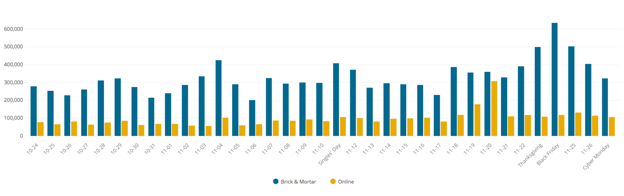 Brick-and-mortar retailers maintained a steady cadence of holiday notifications beginning in early November with dramatic increases on key shopping days versus only slight “day of” increases for online-only retailers.