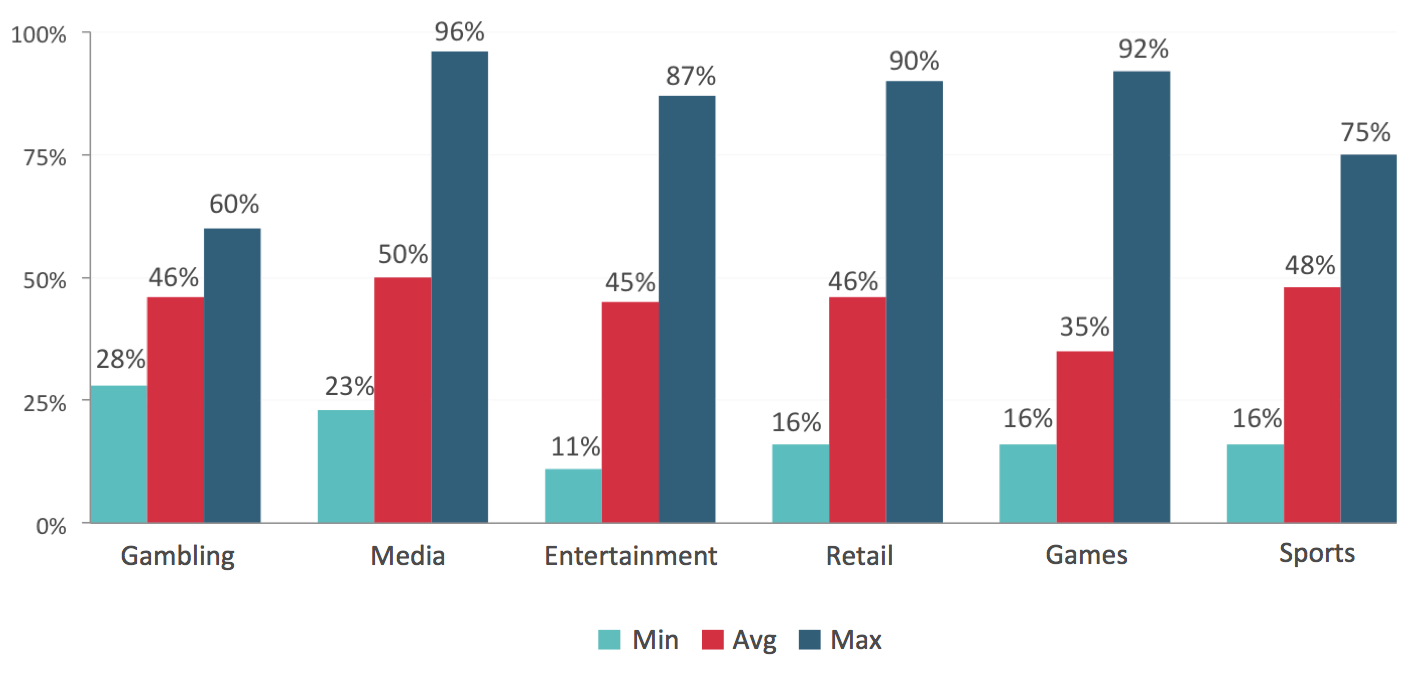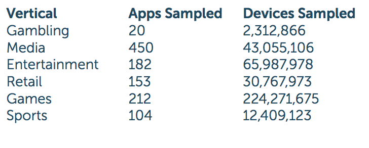 Urban Airship analyzed its customers' data in aggregate to identify apps with at least six-months of opt-in and opt-out user data that had sent at least 100 cumulative pushes in one month during the time period. Analysis included more than 2,400 apps that had collectively sent 500 million pushes. For industry-specific insights more than 1,000 of the most adopted apps were manually categorized into industry verticals. The vertical with the fewest apps—Gambling—still represented more than two million users offering a high-degree of confidence in results.