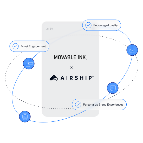 With Movable Ink, Airship users can boost conversions by dynamically inserting rich, contextual information to personalize mobile messages across push notifications, in-app experiences, message center and email. Create a consistently personalized brand experience that drives retention and loyalty by integrating relevant content seamlessly across Airship channels.