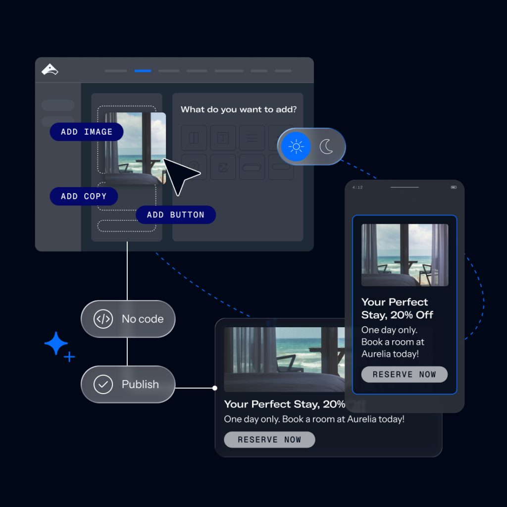 Build once and deploy across your app and website with our no-code editor. Accelerate creation with Airship’s Scenes AI Agent — simply converse to refine experiences and launch faster.