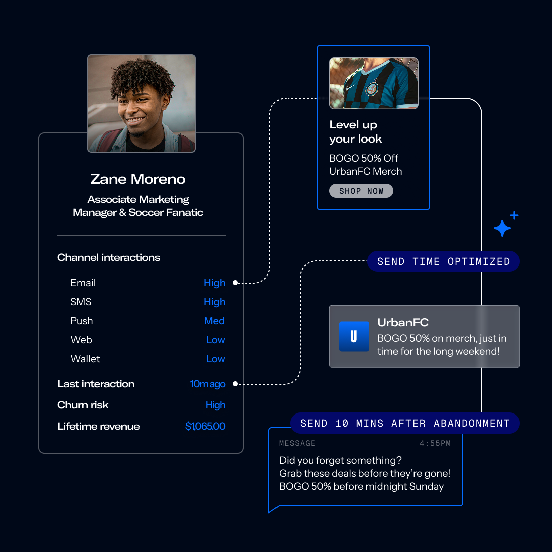Unify cross-channel messages with app and web destinations where customers convert. Use intelligent cross-channel orchestration to create seamless paths that adapt in real time.