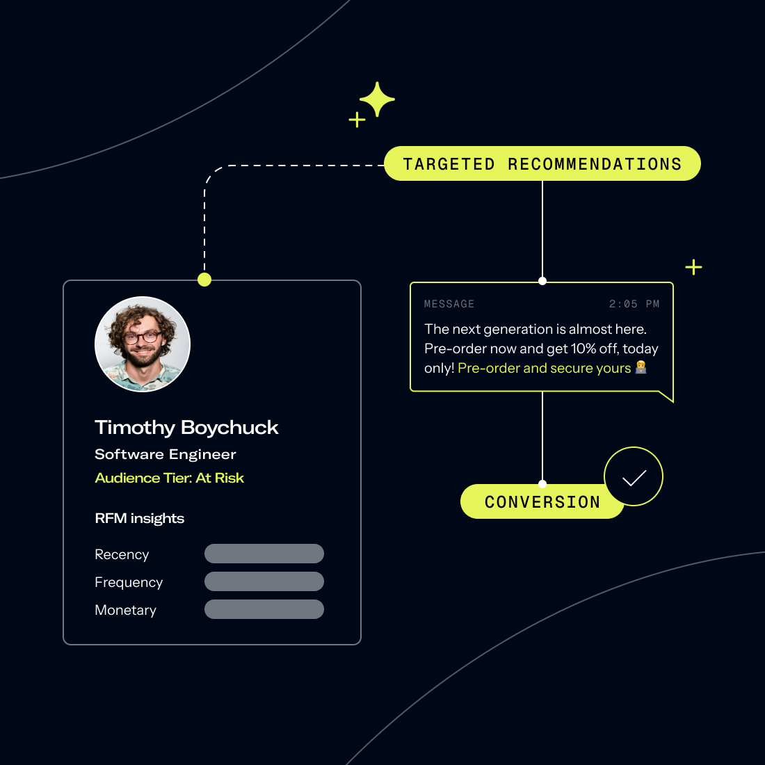 Identify high-value segments using Recency, Frequency, and Monetary (RFM) insights that surface emerging revenue opportunities. Understand shifting behaviors to prioritize customers most likely to convert with targeted recommendations. Drive meaningful uplift by focusing each upsell or cross-sell action where it delivers the strongest return.
