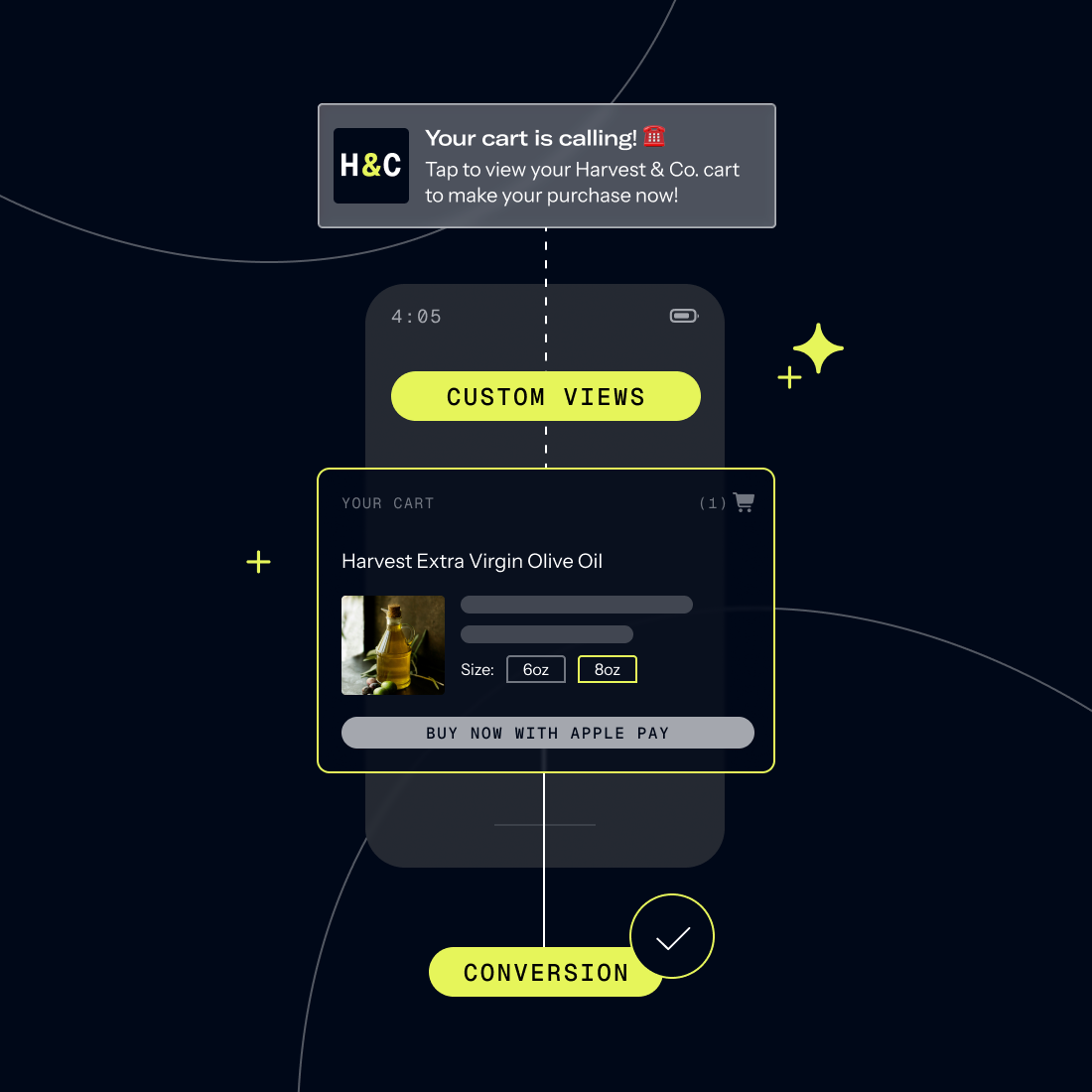 Drive users deep into the app or web through deep links or use Custom Views to display an interactive shopping cart modal directly upon click, removing friction and speeding up checkout.